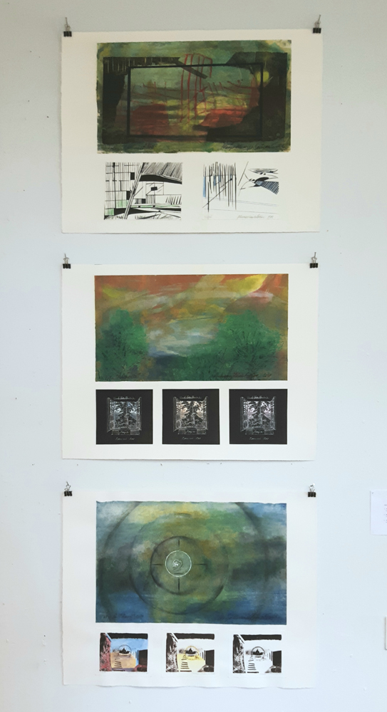 Heinäkuun Kuukauden taiteilijana esittäytyy Maija Kumpulainen-Sokka, kolmella teoksellaan, Rauniot, Matkalla ja Zoom (ylhäältä alas).